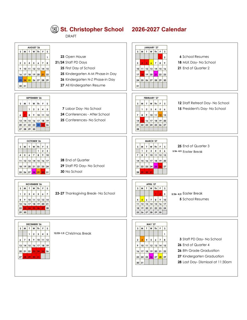 2. I am attaching our Archdiocesan approved 26 – 27 calendar for next year. It is a skeleton… not a lot of info on there. It will give you an idea of start and end dates and days off. It has the word DRAFT under the heading. I will take that off once I get other important dates on there in the next few weeks and feel like it is finalized.