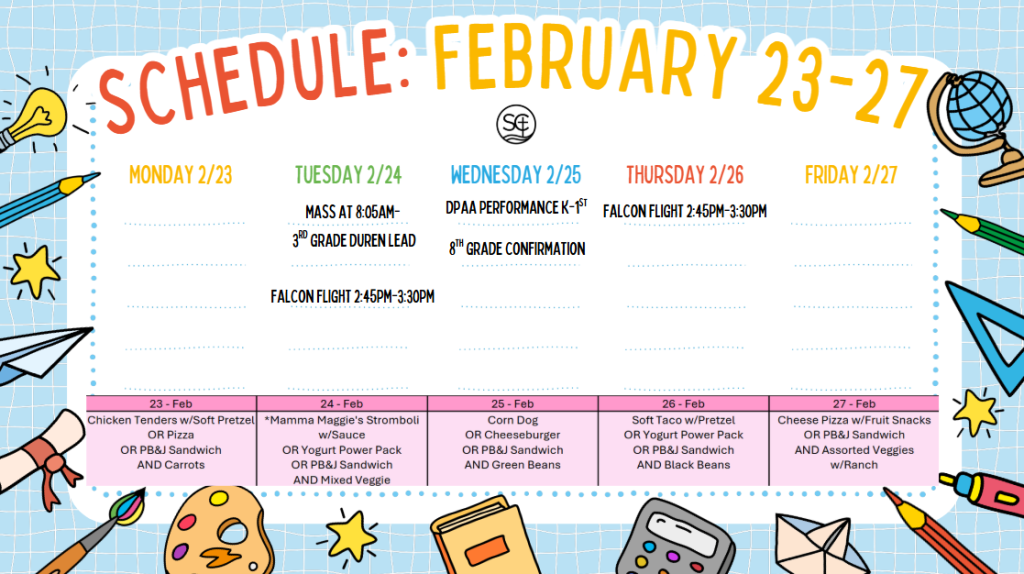 1. A note from Cafeteria Manager, Ms. Shelby: Friday Lent Menu- cheese pizza, boxed lunch, and PB&J (with fruit and veggie).
