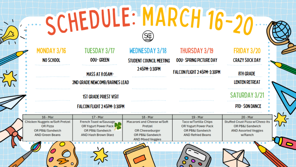 2. A note from Cafeteria Manager, Ms. Shelby: Friday Lent Menu- cheese pizza, boxed lunch, and PB&J (with fruit and veggie).