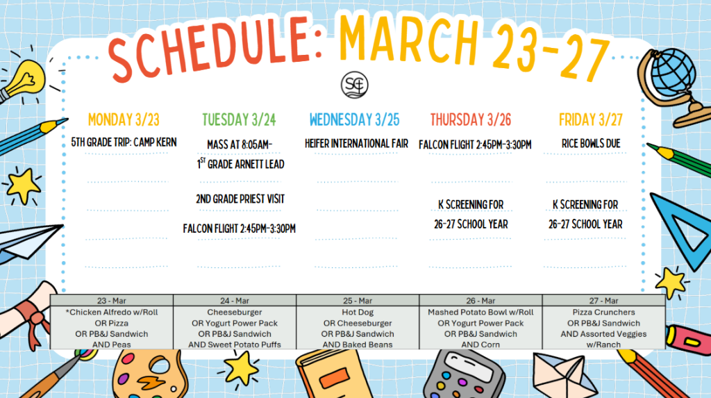 1. Heifer International Update from Mrs. Hartley: Traditionally, during Lent, our 8th grade students take on a fundraising project called ‘Passing on the Gift Promise.’ They take their faith one step further, earning money using the gifts and talents God has given them in order to make a difference in the world community. They have organized a Heifer International Fair to sell their items and will donate the proceeds to Heifer International. We have an anonymous donor who will match whatever they earn. In this project, the class will put discipleship into action, focusing on the Catholic Social Teachings of working for the Common Good, understanding the Dignity of Every Person, Solidarity, and helping the Poor and Vulnerable. The fair will be held on Wednesday, March 25 during lunch periods. Items range in price from $0.50-$5.00. There will be waffles, bracelets, carvings, ice cream, candy, snacks, crochet items, slime, baked goods, and more!