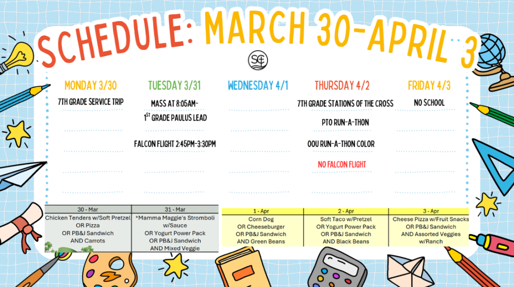 3. No School on Friday, April 3 – Friday, April 10. We are back together on Monday, April 13.